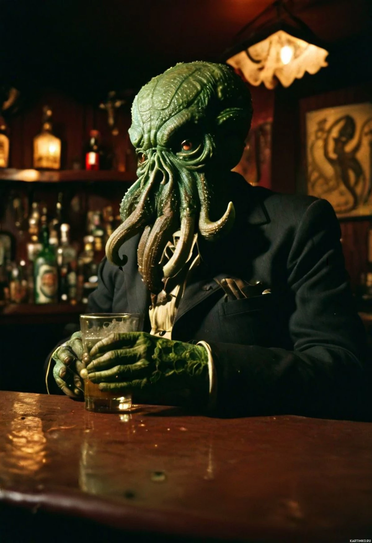 a green body, giving him an otherworldly appearance that contrasts with the mundane setting of the bar.