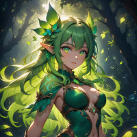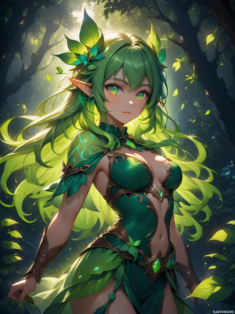 green hair and pointed ears typical of elves in folklore. She wears a vibrant costume with green
