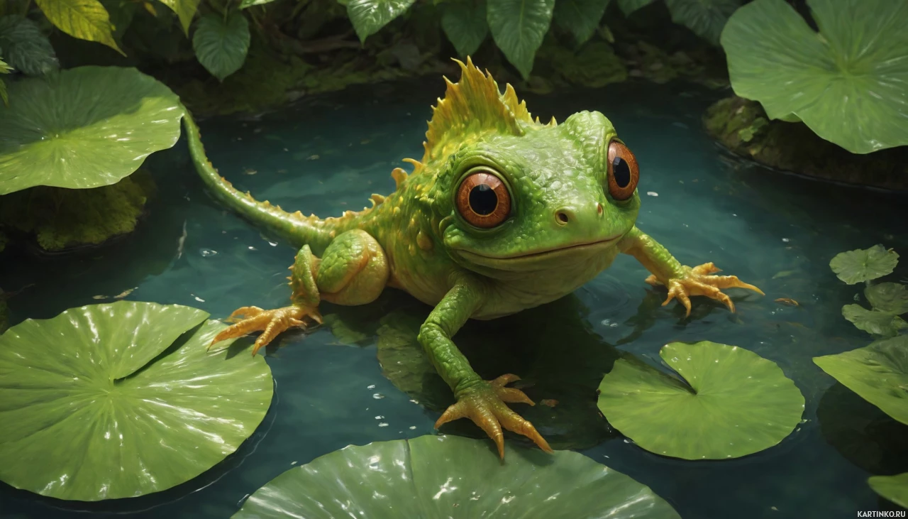 scales in shades of yellow and green, with darker markings on its body, including spikes running down the back and along the tail. The dragon-like being is sitting on lily pads floating in water, which suggests