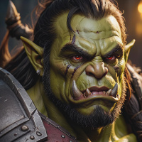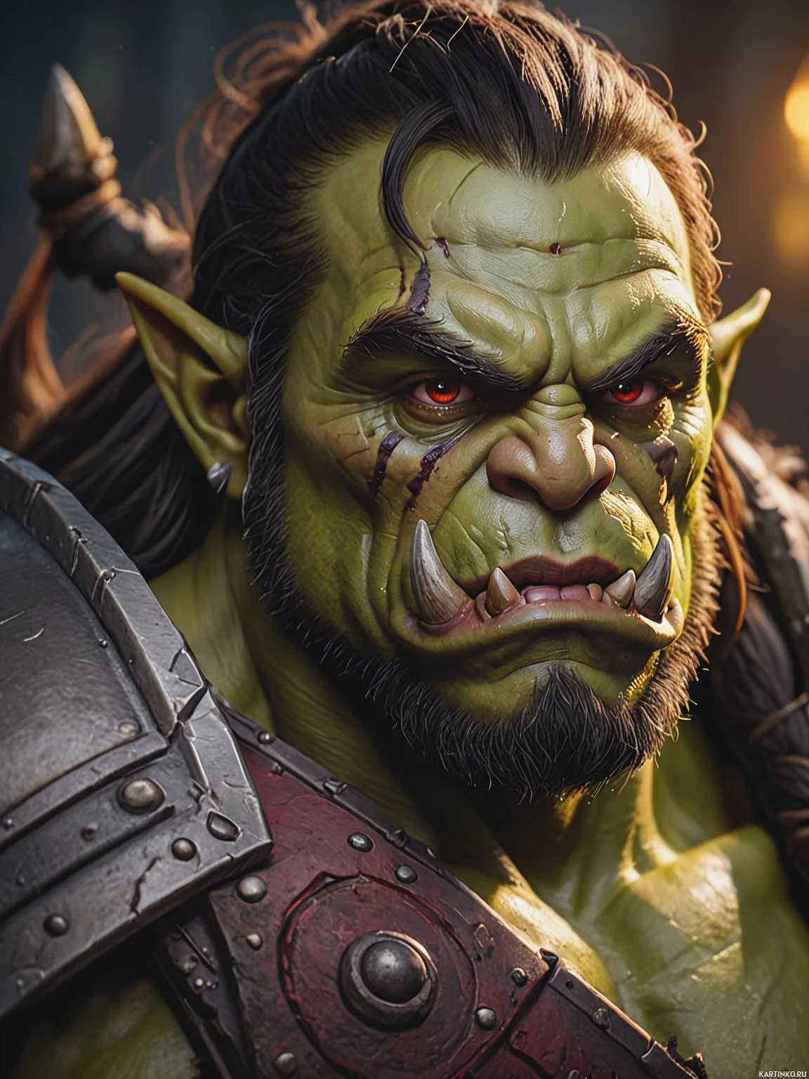 green skin, pointed ears, and a prominent nose, which are characteristics often associated with orcs in fantasy lore. It is wearing armor and has