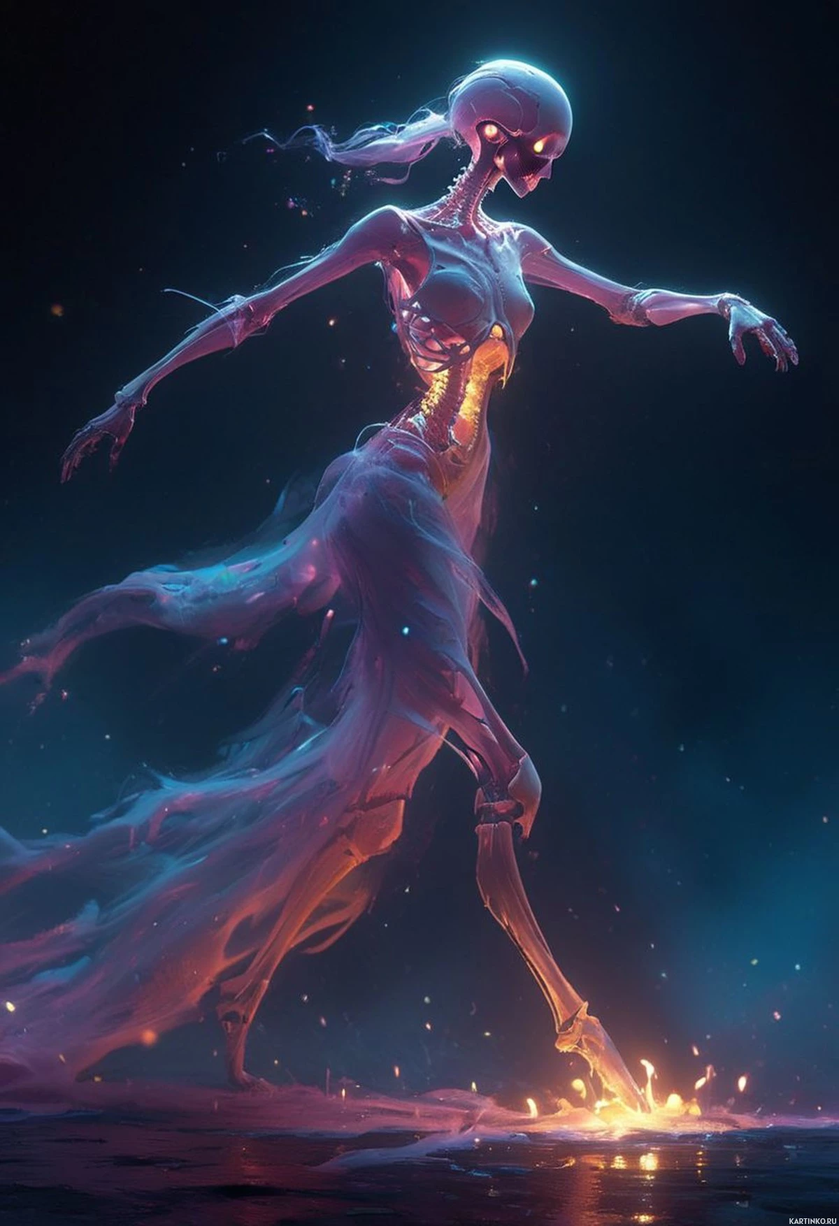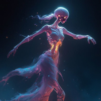 otherworldly beauty, capturing the viewer's attention with the contrast between the macabre skeleton and the delicate, ethereal glow.