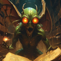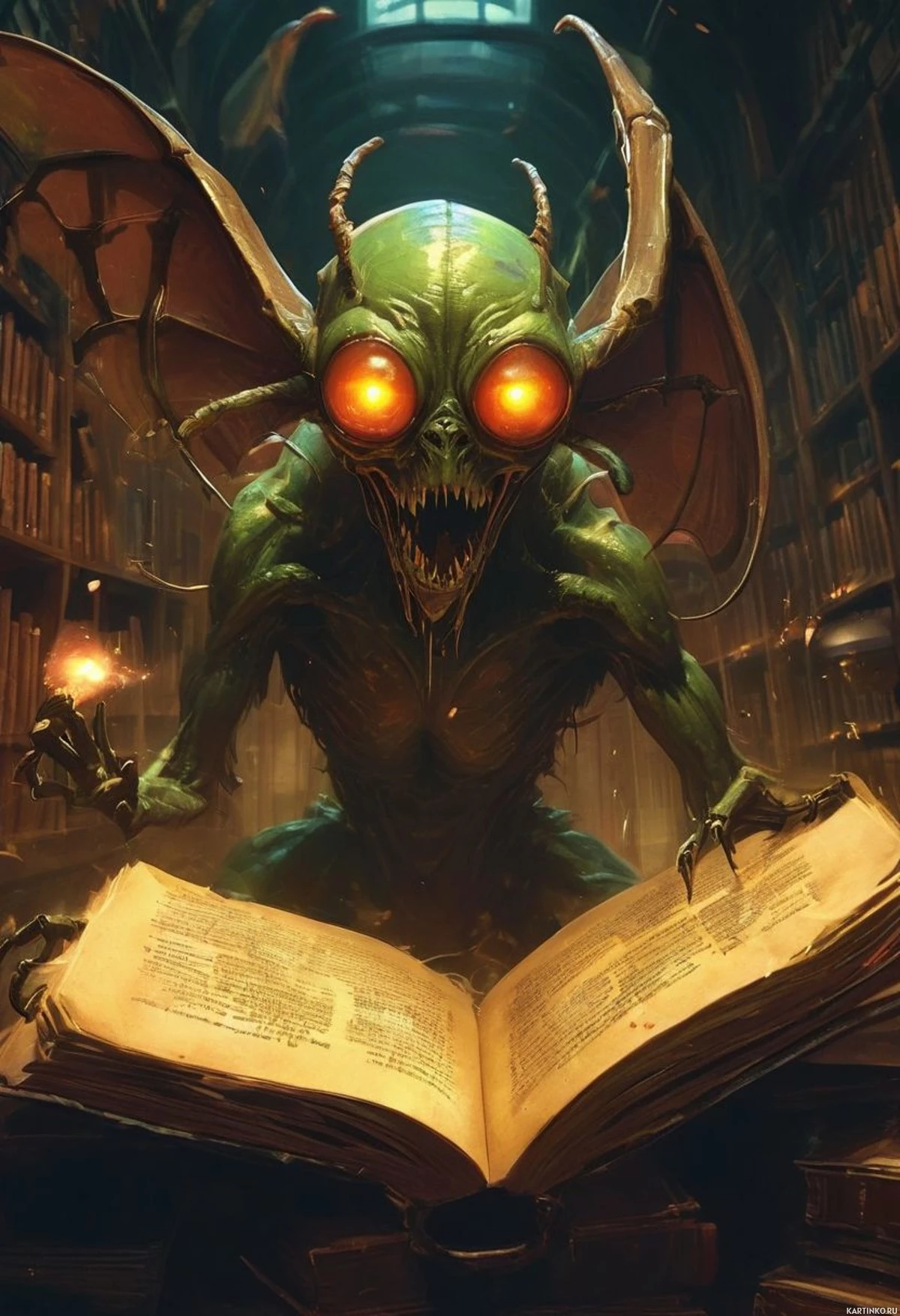 menacing expression. The monster is holding a book open in front of it as if reading from it or perhaps casting a spell. Surrounding the creature is