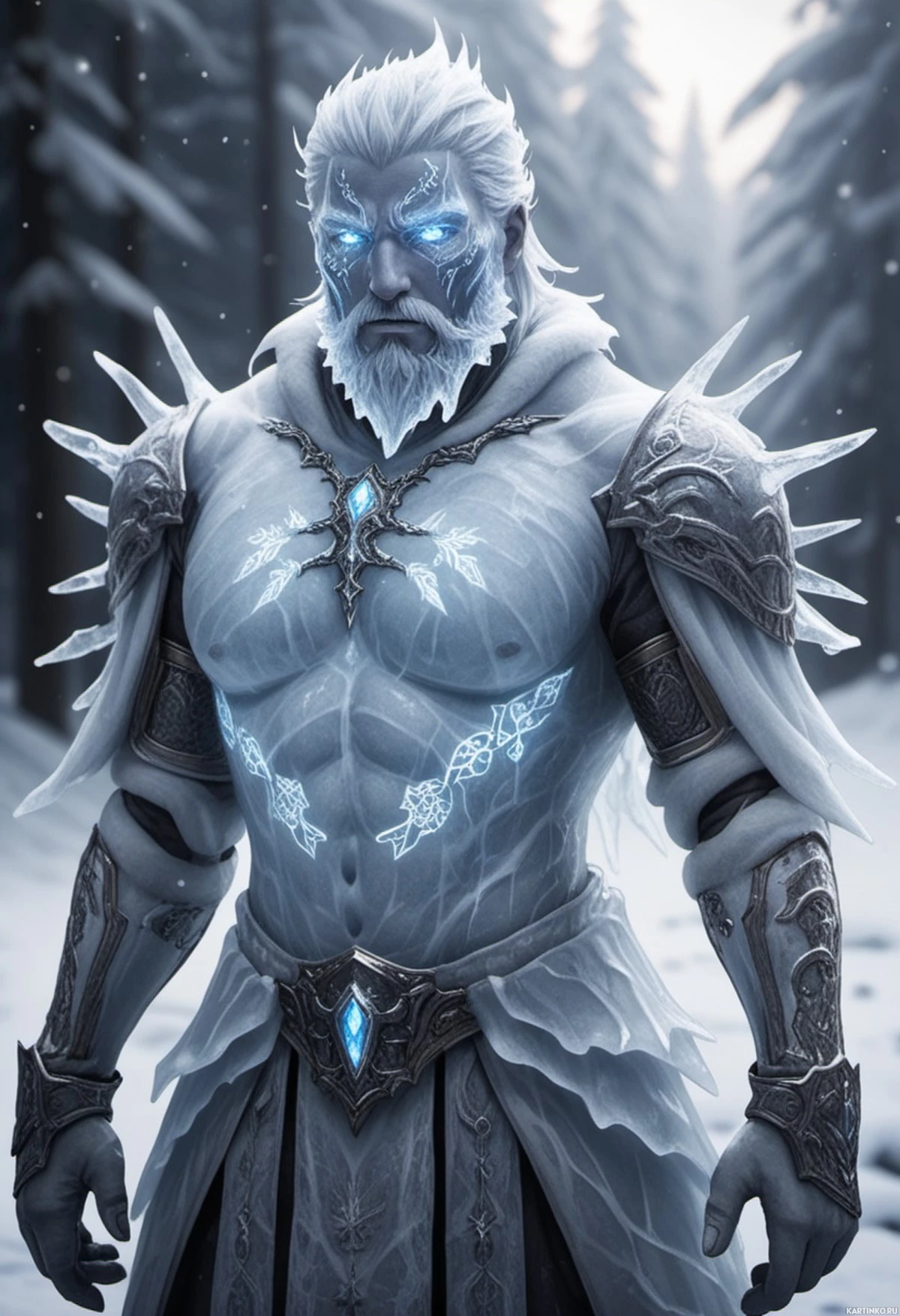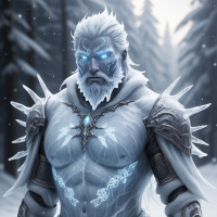 large muscles on his chest and arms, suggesting strength and possibly a warrior's build. The background features a snowy forest scene, with tall trees and a clear sky visible through the open canopy of the forest. The overall style of the image suggests it is from a digital illustration or a piece of concept art for a fantasy setting.