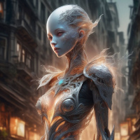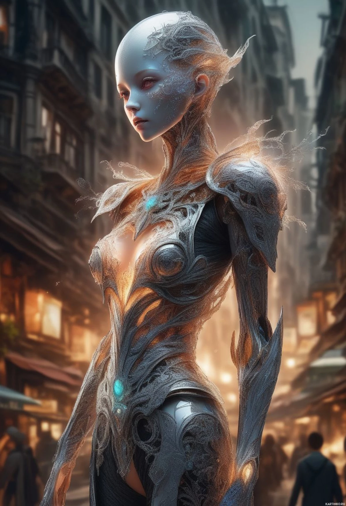 a humanoid form with robotic and organic elements combined. Her head is bald with a metallic headdress that extends backward, incorporating feathers or similar structures that give her a bird-like appearance. She has