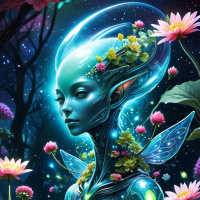 dark accents that blend with the overall color scheme. The character is adorned with flowers that are integrated into its design, adding a touch of natural beauty and enhancing the fantastical aesthetic. These floral elements could be interpreted as living tattoos or decorations on the skin. In the background, there's a dark sky filled with stars, suggesting that this scene takes place at night under a starlit environment. The lighting and shadows cast by these celestial bodies give depth to the image and highlight the character's features. The character is positioned in front of a tree with what appear to be leaves or petals, contributing to the overall naturalistic and mystical atmosphere of the artwork. The contrast between the fantastical figure and the organic elements suggests a blending of nature and magic or technology in this world created by the artist.
