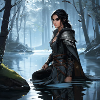 surrounding environment includes trees and a water body that resembles a river or lake, contributing to the serene yet mysterious atmosphere typical of fantasy artwork.