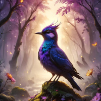 The image depicts a fantasy scene with a blue bird, possibly an illustration of a peacock or similarly colored bird. The bird is perched on a rock in the center of the image. The background features a forest path lined with tall trees and blossoming flowers. The lighting suggests either early morning or late afternoon sunlight filtering through the canopy, creating a serene atmosphere.