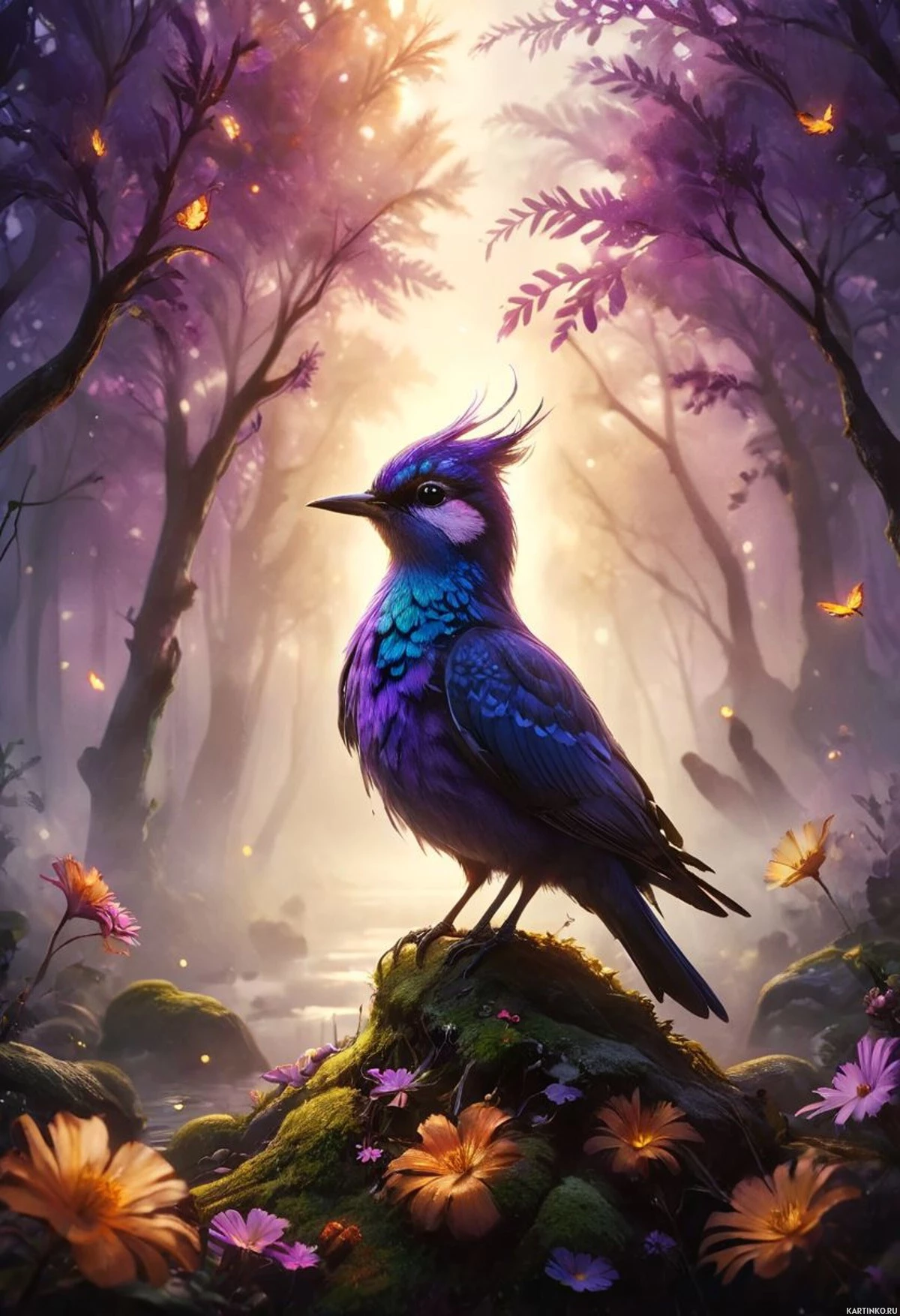 На картинке изображена сказочная сцена с голубой птицей, возможно, иллюстрацией павлина или птицы схожей окраски. Птица сидит на камне в центре картинки. На заднем плане виден лесной тропинка, обрамленная высокими деревьями и цветущими цветами. Освещение намекает на утреннее или вечернее солнце, пробивающееся сквозь кроны, создавая спокойную атмосферу.
