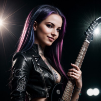 a leather jacket, which adds to the edgy and modern look associated with certain rock genres. The guitar in her hands indicates that she may play