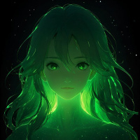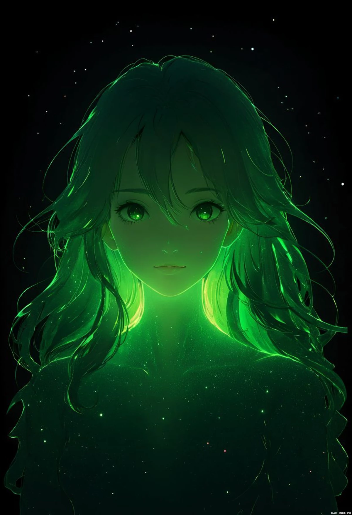expressive eyes and is wearing what appears to be a dark top or shirt. There are neon-green lights emanating from her neckline and illuminating the area around her face, which adds a futuristic or mystical element to the image. The background suggests