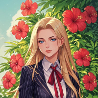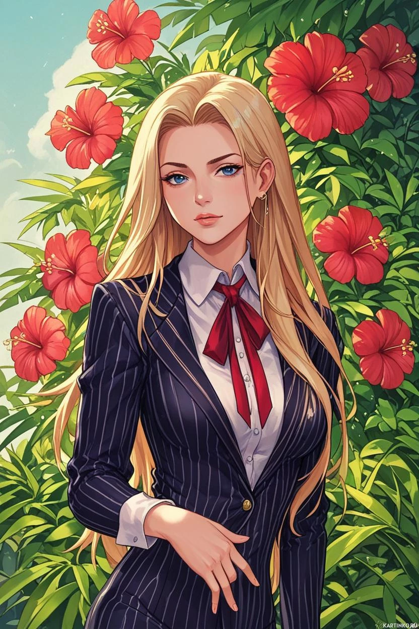 a dark suit, complete with a tie and jacket, which gives her an elegant appearance. Her pose suggests confidence, as she holds her hands on her hips while standing amidst flowers. The flowers are vibrant, with red and yellow petals, adding a lively touch to the otherwise