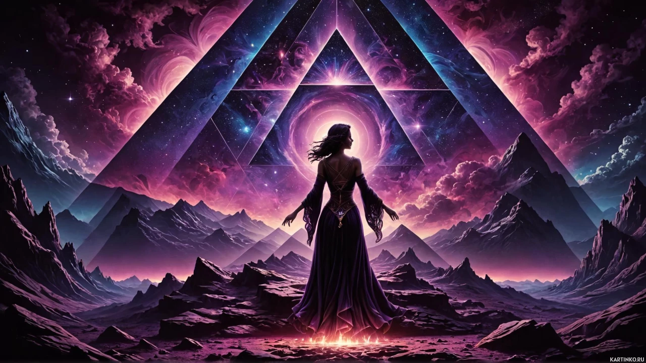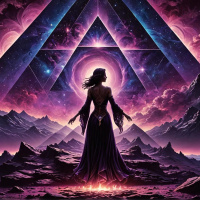 the mystical atmosphere of the image. - The color palette is dominated by deep purples, blacks, and blues, which contributes to the otherworldly and mysterious vibe of the artwork. The overall mood conveyed by the image is one of mystery, power, and possibly spiritual or magical themes. The use of color and lighting effects creates a sense of depth and dimension in the scene.