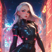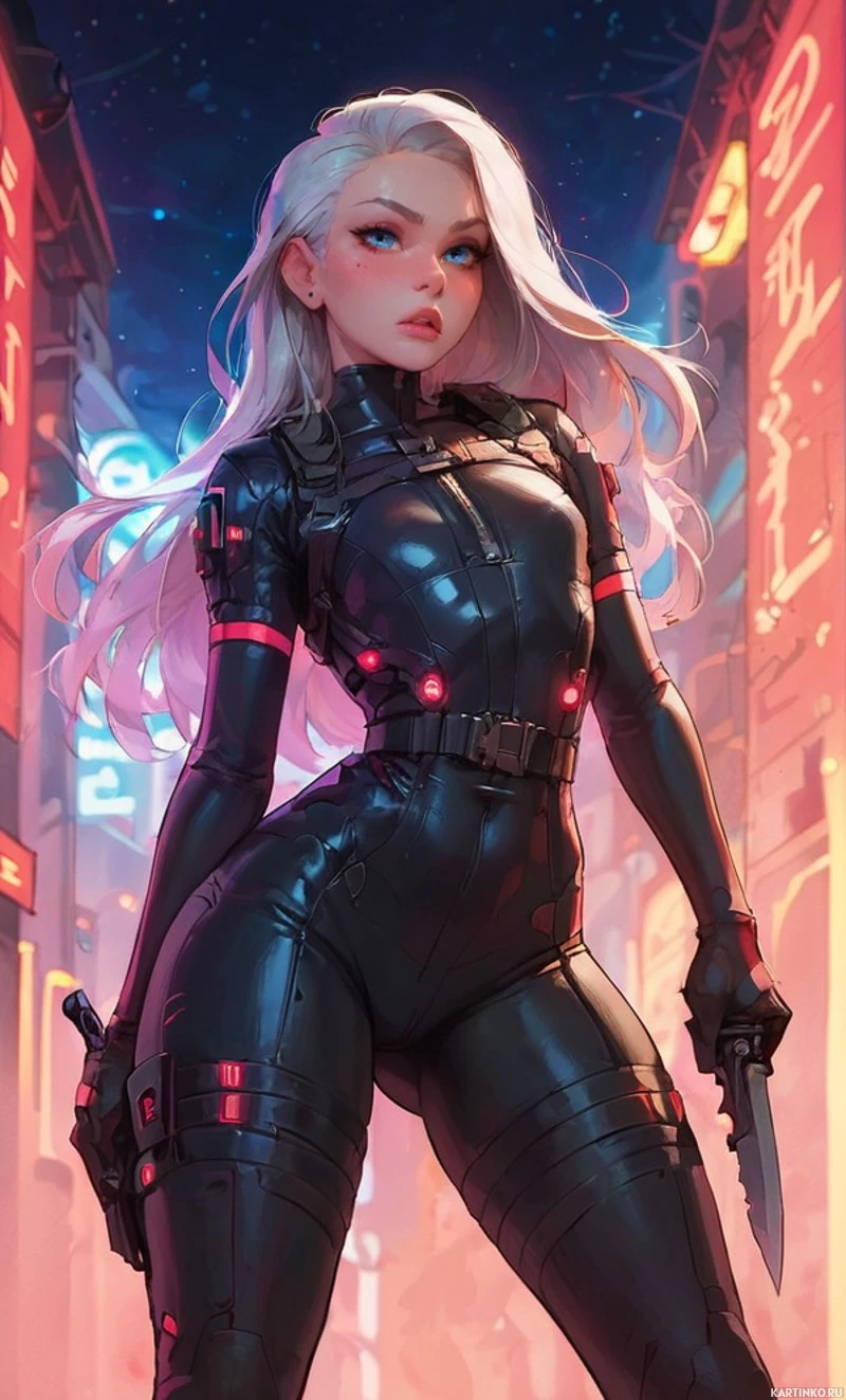 urban environment that looks like it could be inspired by a city's neon lights, with signs that include both English and Japanese characters, suggesting an Asian influence in the artwork. The style of the illustration is dynamic and detailed, giving a sense of movement to the character's pose and