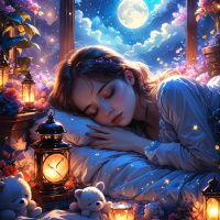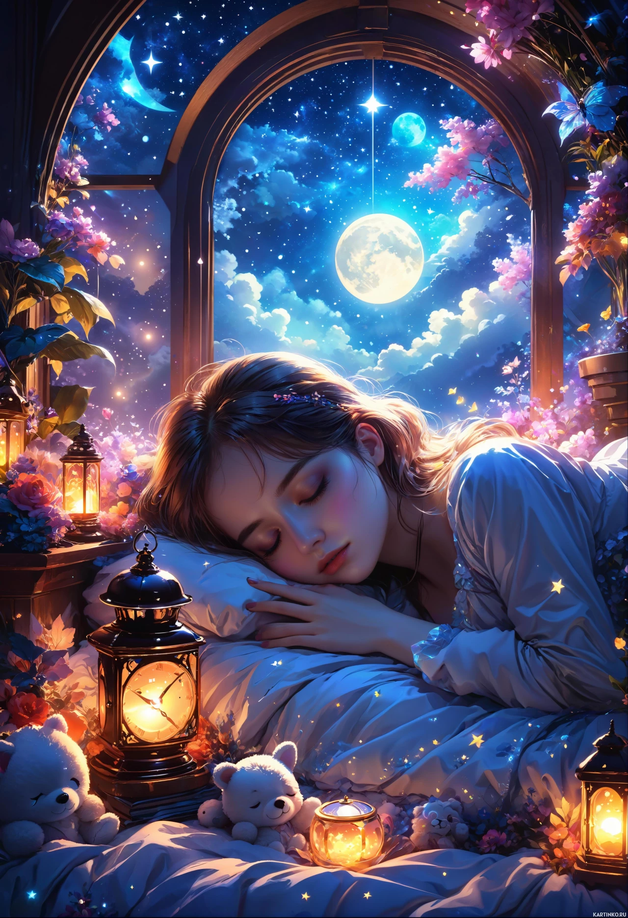 a night sky with clouds, a crescent moon visible in the top right corner, and a large window with arches that let in soft light, enhancing the ethereal quality of the scene. The overall mood is one of tranquility and restfulness.