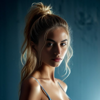 blonde hair and her pose suggests confidence and elegance. The setting has a dim blue-toned ambiance, which contrasts with the brightly lit face of the woman, creating