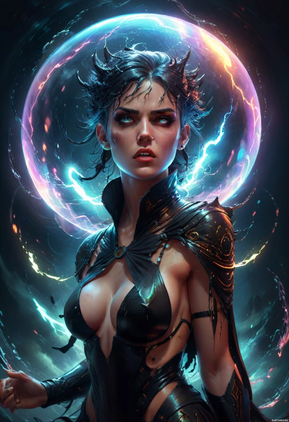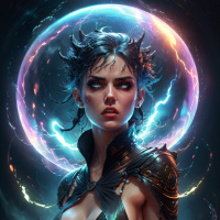 an artistic backdrop that includes circular patterns and swirling colors, adding a fantastical element to the image. The overall style suggests that this could be from a fantasy or sci-fi setting.