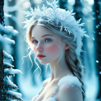 covered trees surround her, with their branches visible through the flurry of snowflakes. Despite the cold environment suggested by the snow, she appears undeterred and poised, suggesting a sense of enchantment or magical ability associated with her character design. The overall image is vibrant with a mix of natural lighting and colorful digital artistry, making it visually appealing and evoking a fairy-tale quality.