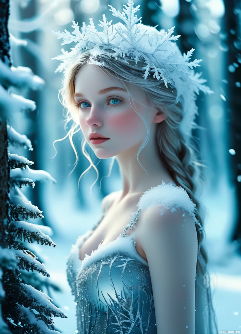 facial expression is neutral with a soft smile on her lips. The girl is adorned in a frosty, snow-themed outfit that includes what seems to be silver or white