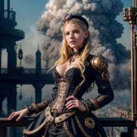 fantastical environment. The character has an expression that is somewhat stern and focused, which adds to her formidable appearance. The overall atmosphere of the image conveys
