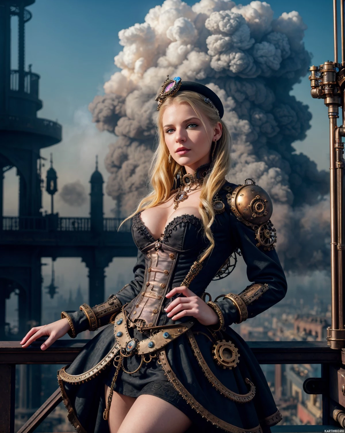 a female character with blonde hair, styled in an edgy fashion. She is wearing a dark-colored armor and is standing on what appears to be the deck of a ship or a structure that resembles part of a battleship or