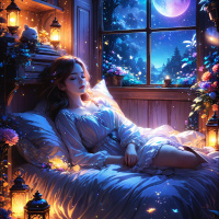 a full moon visible outside the window, adding to the enchanting ambiance of the scene. The artwork is highly detailed and colorful, with a fantasy or dream-like quality to it.