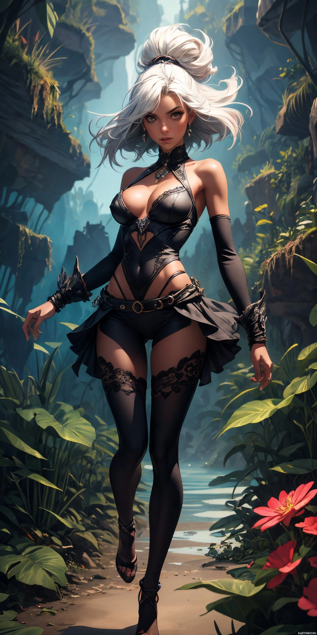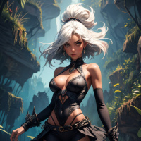 a jungle environment, as indicated by the foliage around her. The art style is typical of modern