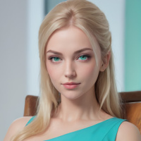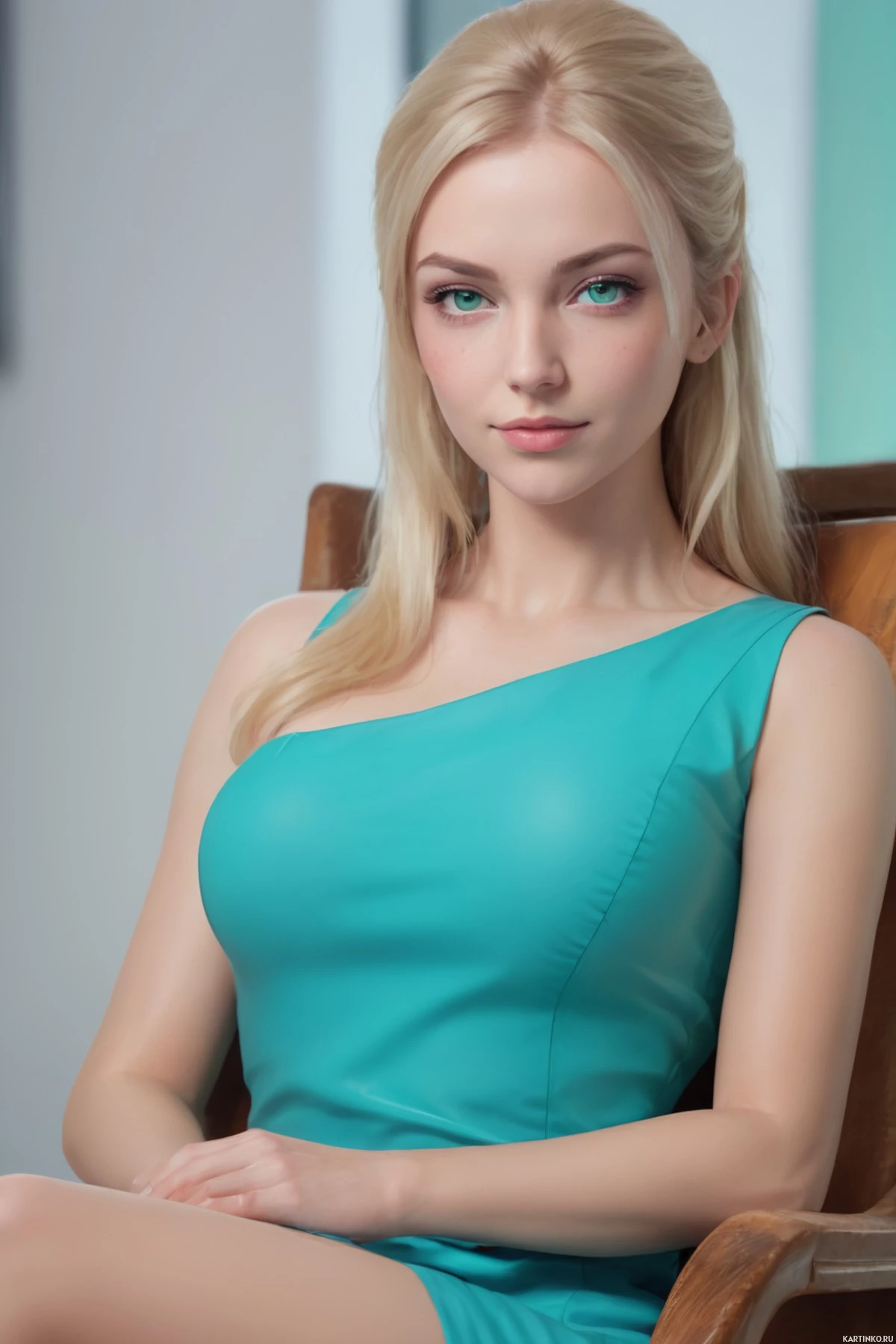 blonde hair and is wearing a light blue dress with a high neckline that suggests a formal or glamorous outfit. Her pose and the setting give off