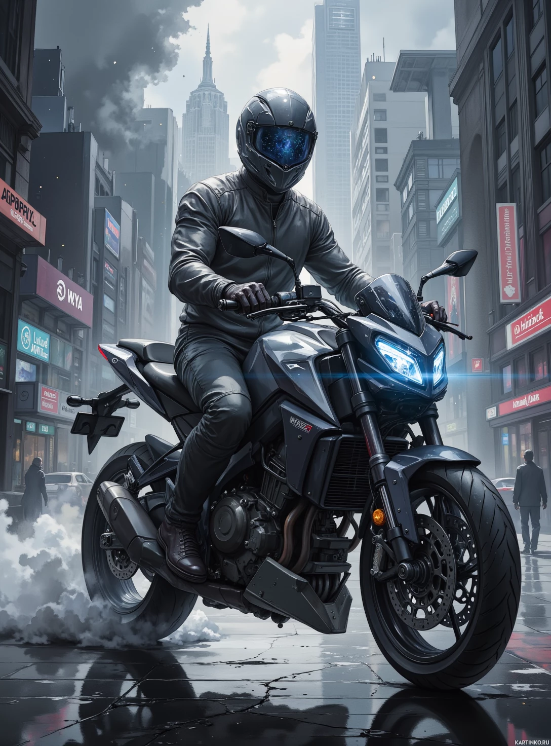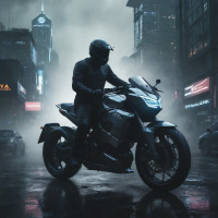 protective gear, including a full-face helmet and a jacket with a high collar. The motorcycle appears to be a sport bike with aggressive styling, featuring prominent