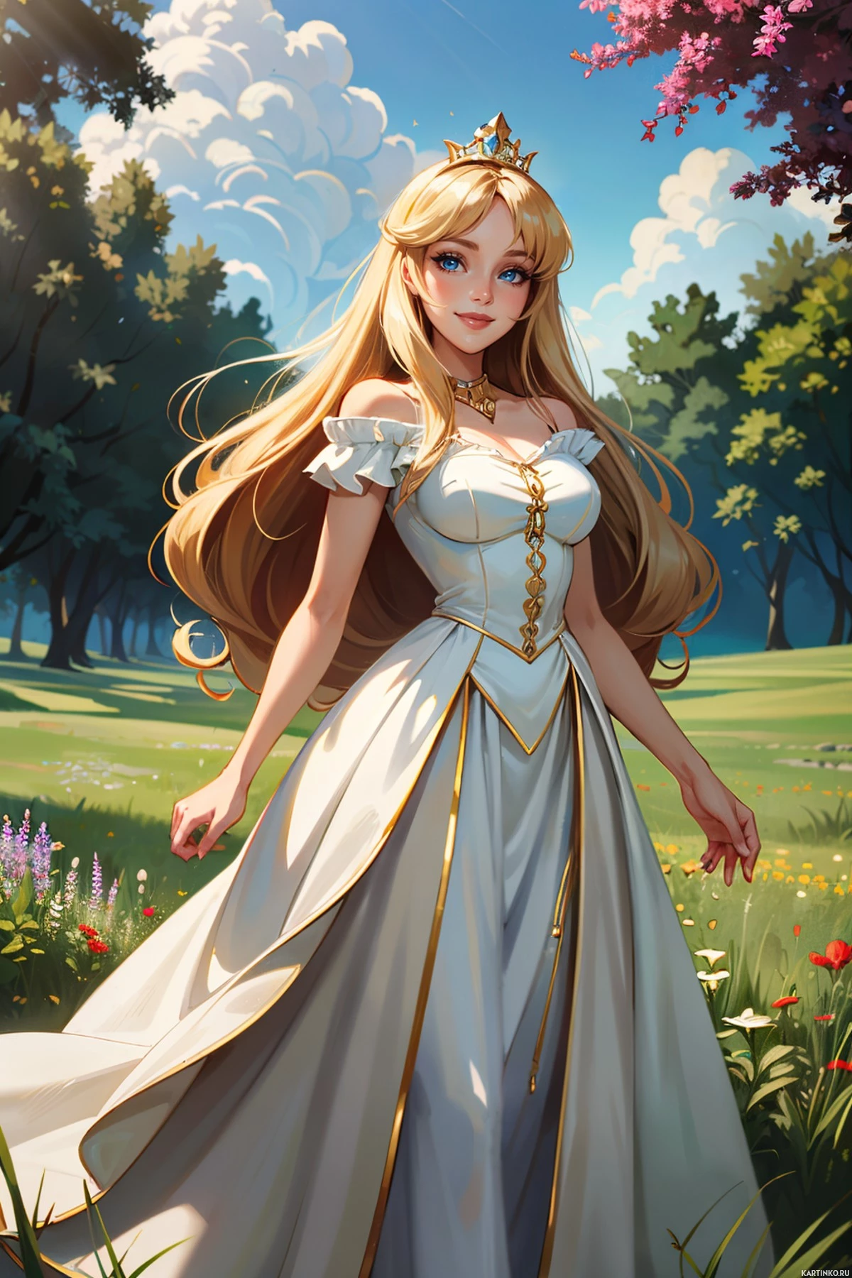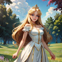 blonde hair and is wearing a white dress with golden accents that resemble armor pieces, suggesting a fantasy or royal theme. The character is adorned with a crown on her head, further emphasizing her