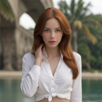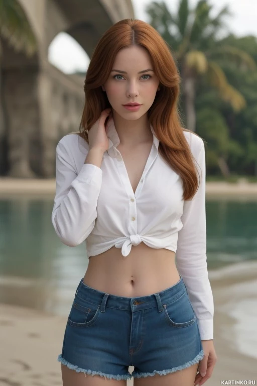 На картинке молодая женщина с рыжими волосами стоит на пляже. На ней белая блузка с рукавами, подвернутыми до локтей, и джинсовые шорты, заканчивающиеся чуть выше колен. Блузка расстегнута сверху, обнажая небольшой участок живота. Она смотрит прямо в камеру с невозмущенным выражением лица. На заднем плане виден бетонный мост, перекинутый через водную гладь. Небо ясное, и на улице день.