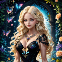 a fantastical setting with arched windows or portals framing her figure. Through these openings, one can see butterflies fluttering around, adding to the enchanting atmosphere of the scene. The overall style is reminiscent of fairy tales and magical realms, with a focus on fantasy and beauty.