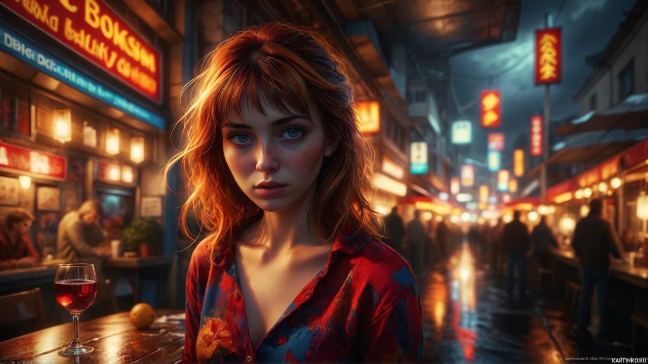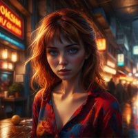 fair skin and is wearing a dark top with some colorful patterns on it. Her posture suggests she might be lost in thought or waiting for something. The setting appears to be an outdoor street scene at night, possibly from a modern