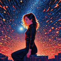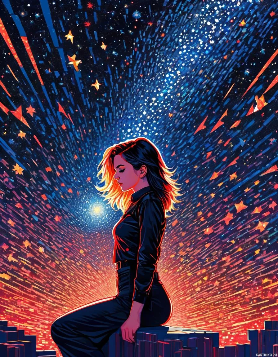 a vibrant array of colors that suggest stars and space elements, with shades of blue, purple, yellow, and orange creating an impressionistic galaxy-like background. The overall feel of the image is dreamlike and inspirational.