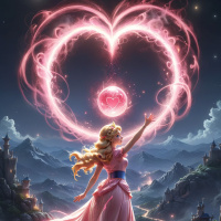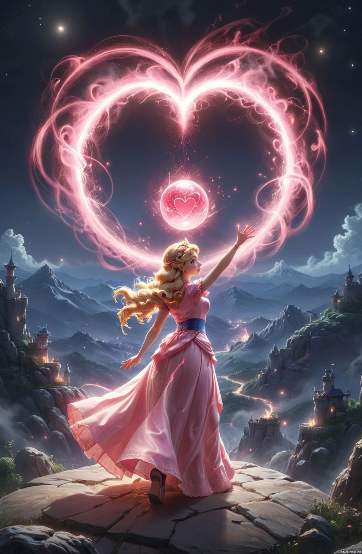 majestic mountains in the background, illuminated by the glow of what appears to be a large heart-shaped portal or vortex. The colors are vibrant with pink and purple hues dominating the scene, adding a mystical and otherworldly feel to the image. The overall atmosphere of the picture is one of enchantment and wonder, evoking a sense of