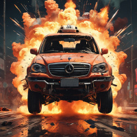 a dramatic scene involving a vehicle. In the center, there is an orange Mercedes-Benz G-Class SUV that appears to be in motion and being propelled towards the right side of the frame by