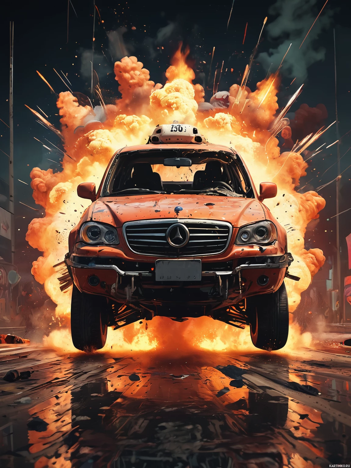 an urban setting or perhaps a warehouse area, given the gritty appearance. The art style leans towards realism, capturing fine details of the vehicle's design and the explosive effects. The overall mood conveyed by the image is intense and action-packed, potentially indicating danger or an event of high impact.