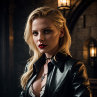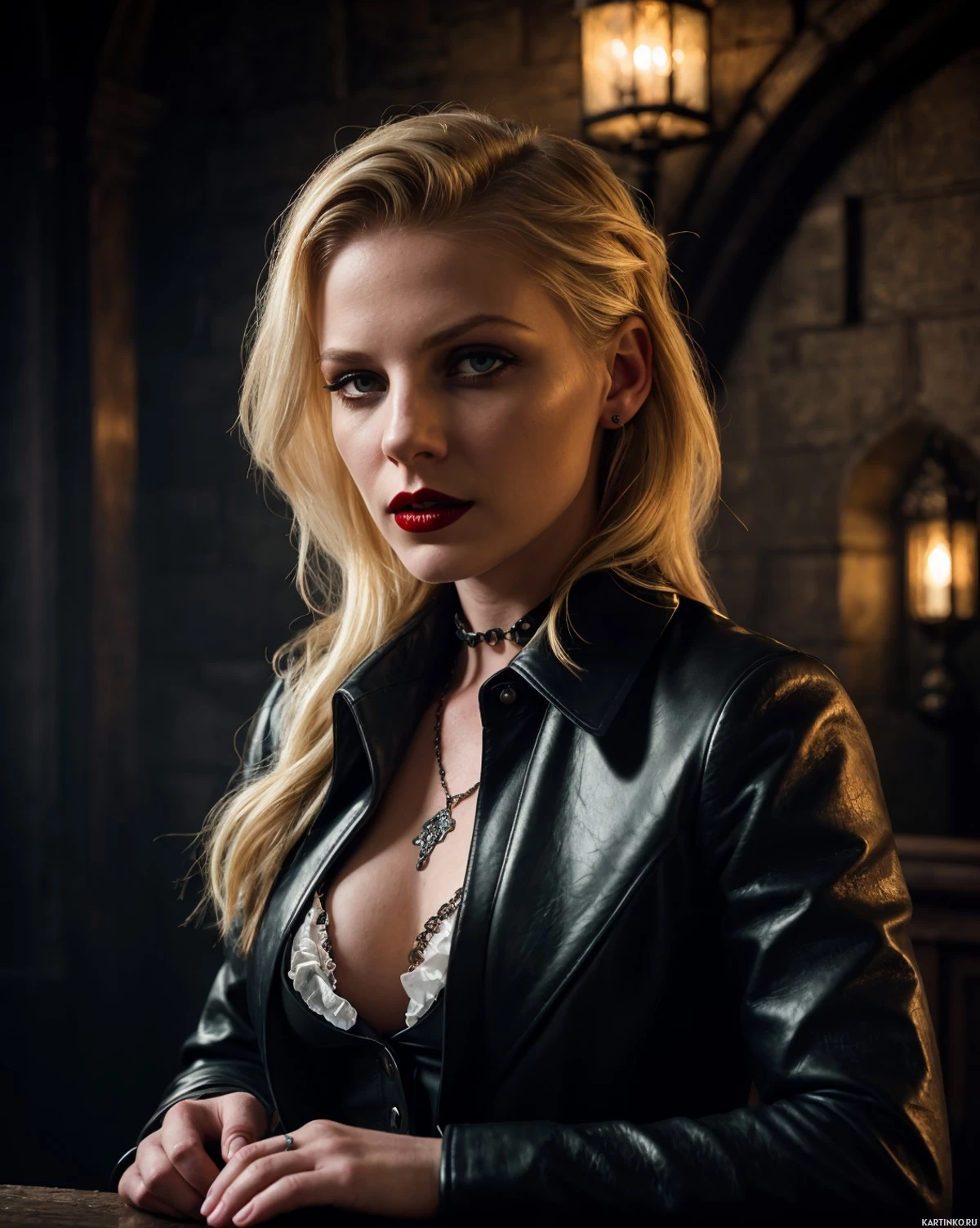 На картинке запечатлена молодая женщина с светлыми волосами, смотрящая прямо в камеру с невозмущенным выражением лица. У нее светлая кожа, а цвет глаз, вероятно, темно-коричневый или черный. На ней черная кожаная куртка поверх, похоже, кружевной блузы, что создает контраст текстур в ее наряде. В ее одежде присутствует корсет с высоким воротником, что может указывать на то, что она играет какую-то роль. У нее на шее крестик и заметная татуировка на левом предплечье. Фон затемнен и содержит архитектурные элементы, которые могут намекать на внутреннее помещение, похожее на бар или паб. Освещение создает таинственную атмосферу, акцент сделан преимущественно на лице и верхней части тела женщины.