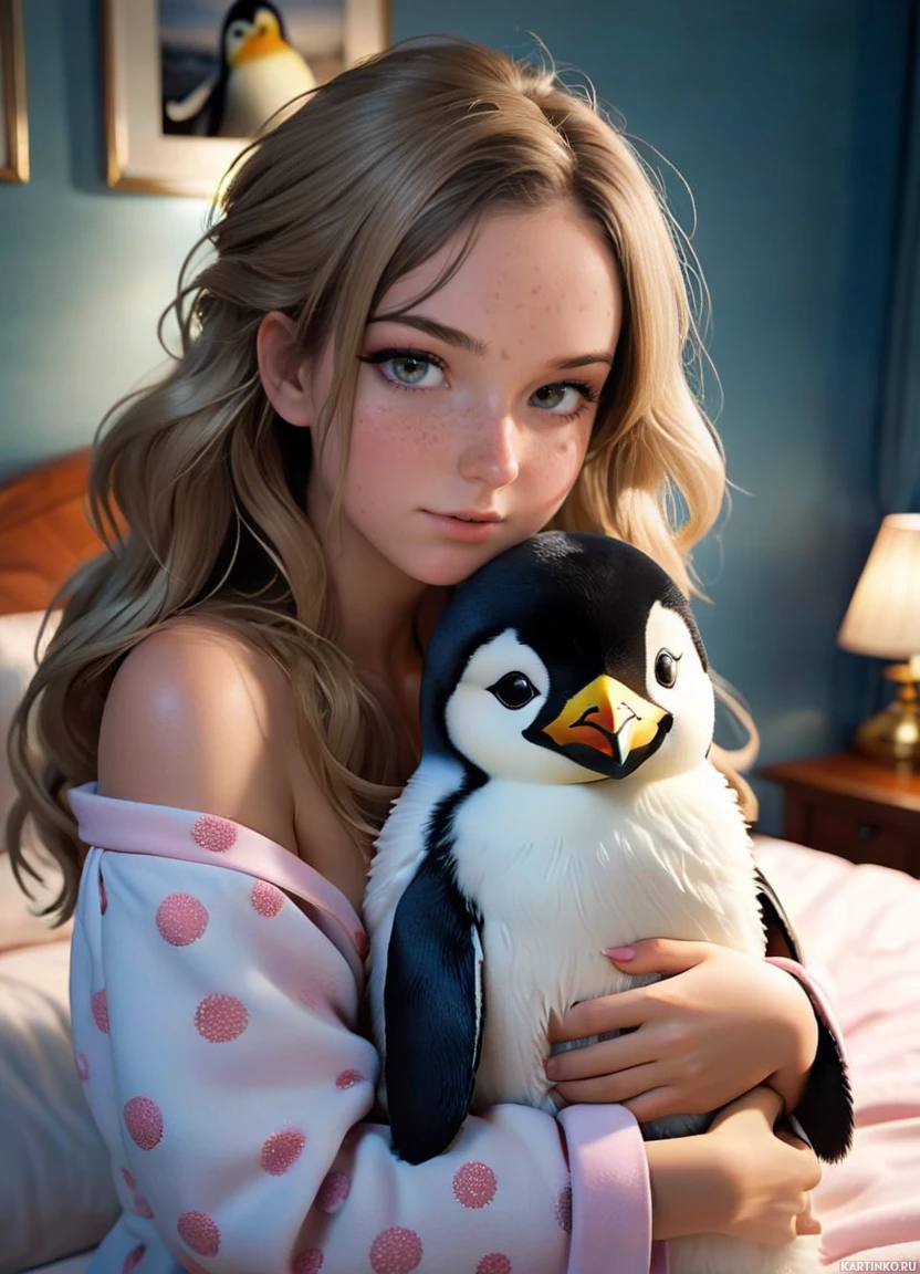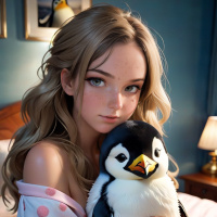 a neutral expression on her face. Resting in her lap is a penguin, which appears to be a character from