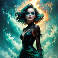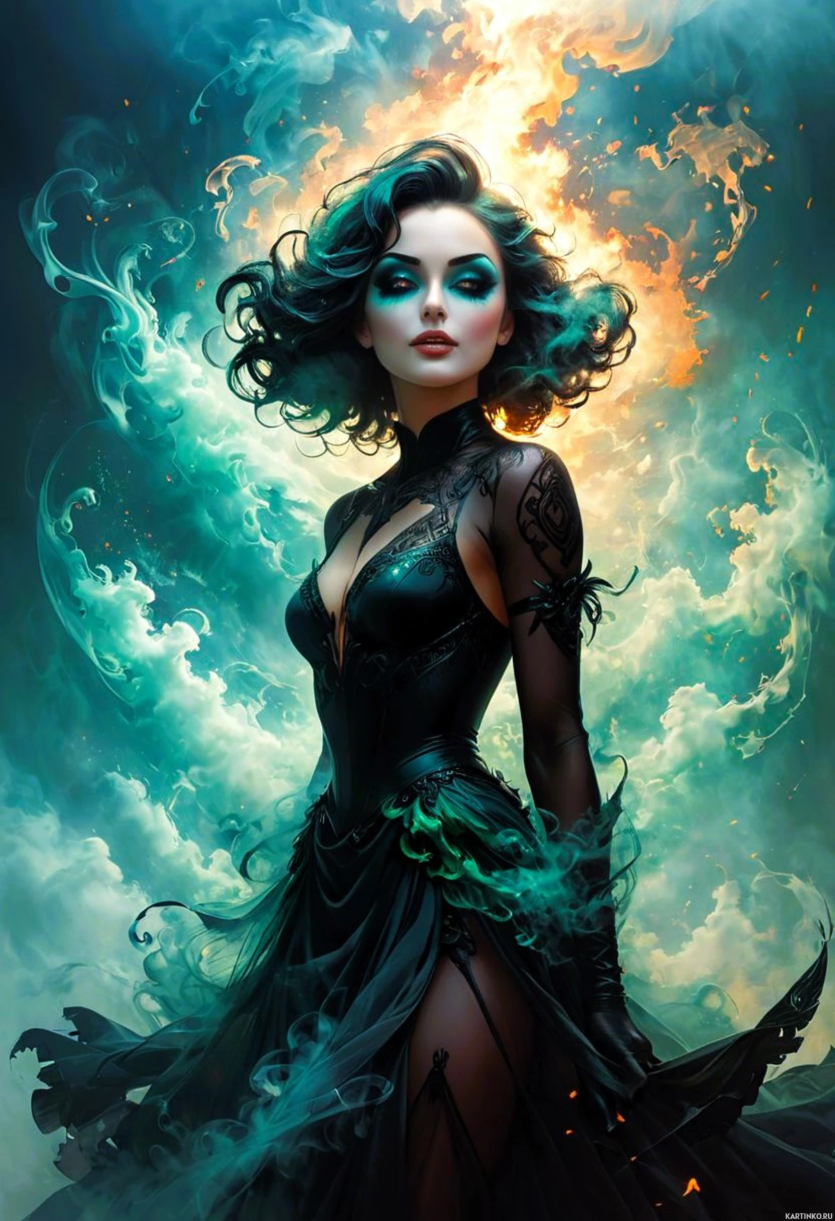 intricate patterns that suggest some sort of magical or mystical theme. The background consists of ethereal elements like light flames and swirling clouds, which contribute to