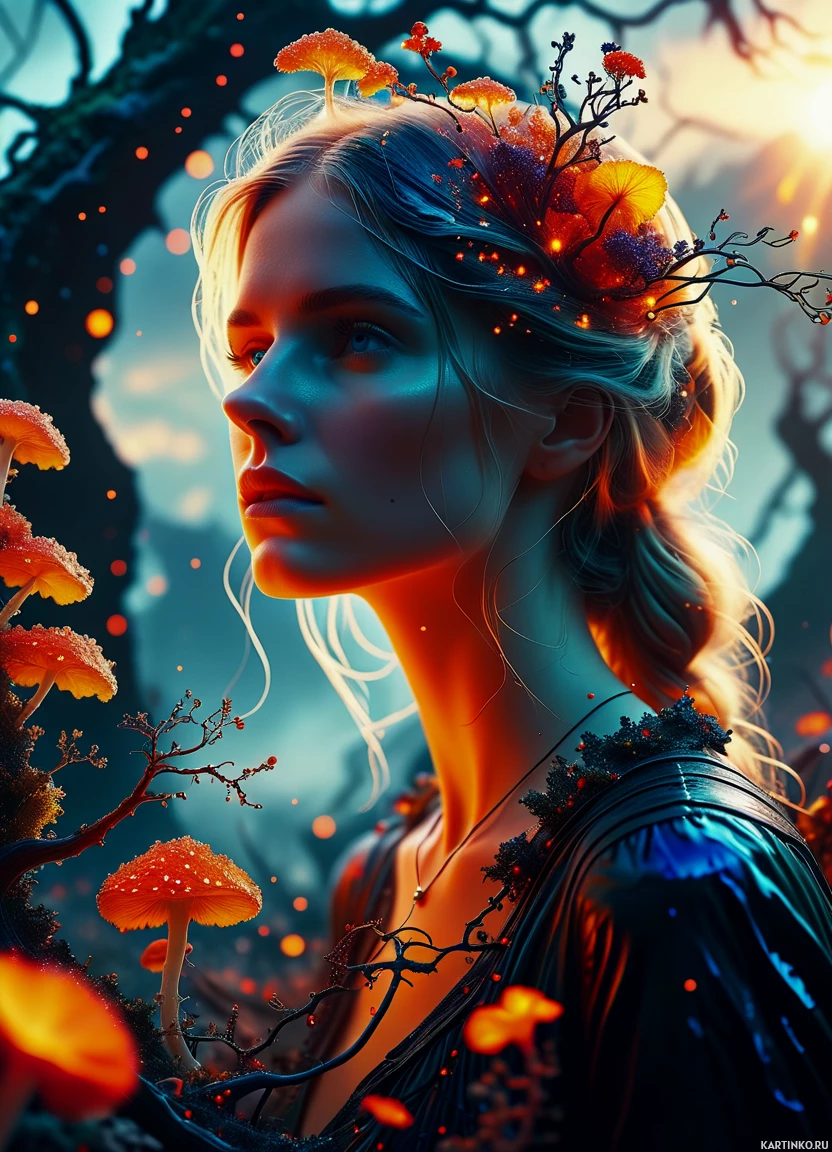 a forest scene at dusk or dawn, as suggested by the soft lighting and the glow from what could be moonlight in the background. On either side of her face are mushrooms growing on