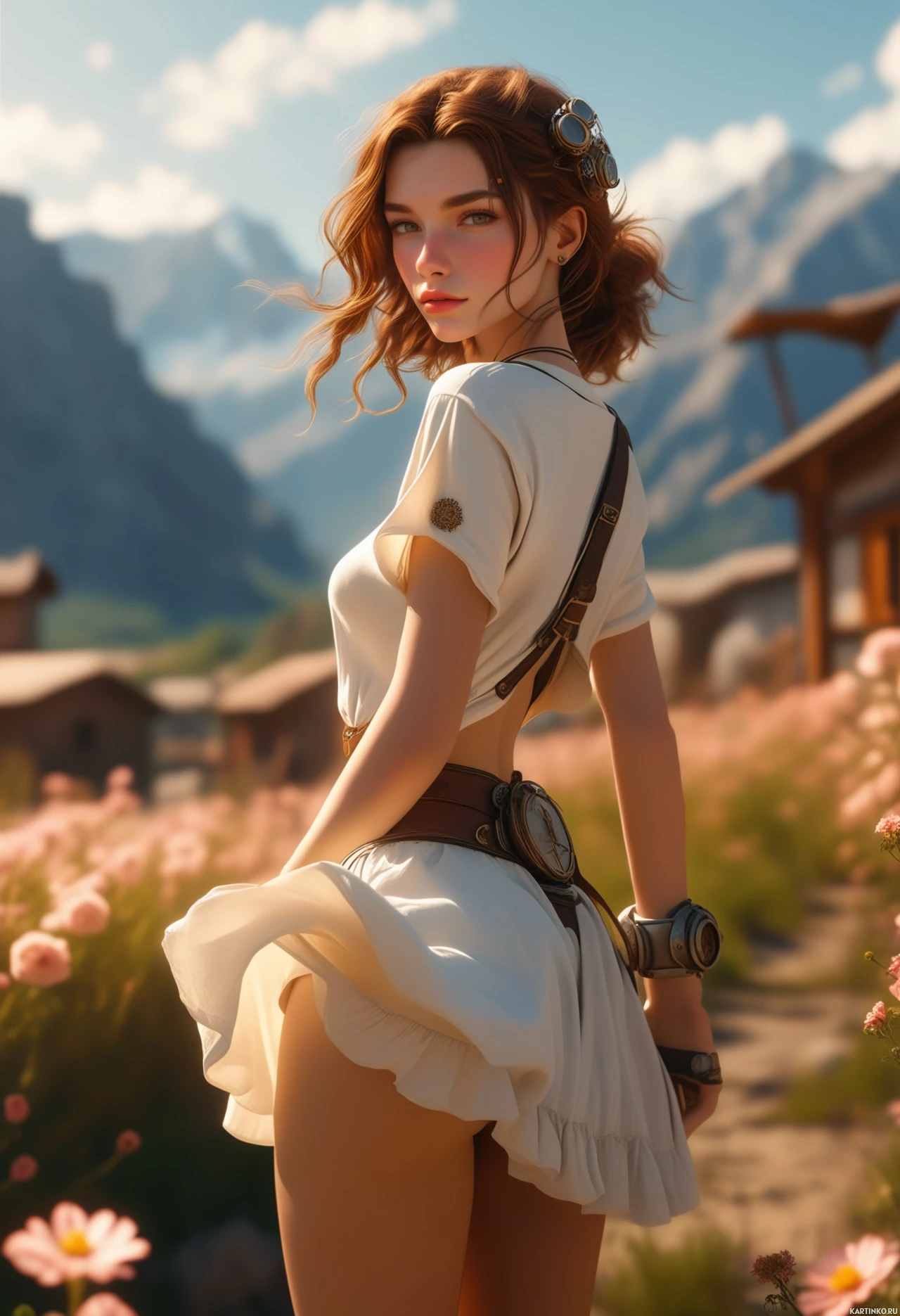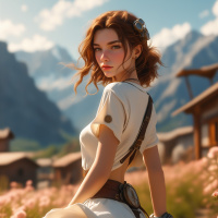 a small bag around her waist, which might suggest she's on a journey or an adventure. The background features a rustic scene with wooden buildings nestled amidst a valley flanked by mountains under a partly