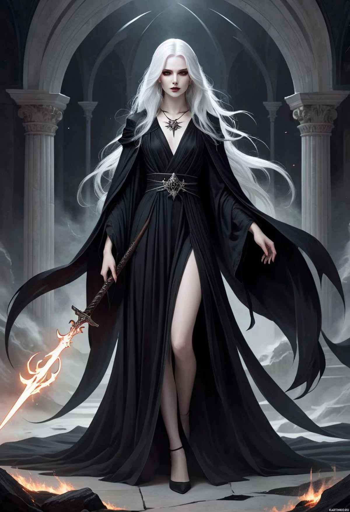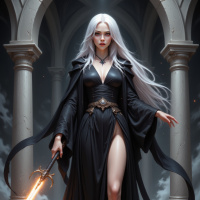 На картинке изображена женщина с белыми волосами, стоящая в роскошном окружении, напоминающем собор или храм. На ней тёмное одеяние, а в руках посох с пламенем на конце. Наряды украшены сложными деталями, что указывает на фантастическую или историческую тематику. На заднем плане видны архитектурные элементы, такие как колонны и витражное окно, освещающее пол.