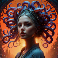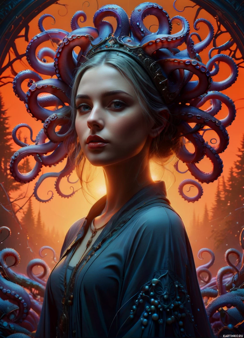 blue eyes and is wearing a headpiece that resembles the tentacles of an octopus or squid. This ornate headdress features a rich blue color with