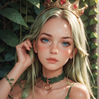 На картинке молодая женщина со светлой кожей и длинными волнистыми светлыми волосами. Она закрыла глаза и прикоснулась рукой к подбородку, словно задумалась или наслаждается моментом. Её губы слегка приоткрыты, и видно, что она накрашена, акцент сделан на скулы и губы. На ней богато украшенный зеленый корсет с золотыми элементами, напоминающими корону, что указывает на царственный или сказочный стиль одежды. Корсет украшен сложными деталями и, кажется, покрыт листьями или декоративными элементами, ниспадающими на одно плечо, что добавляет образу неземной вид. На заднем плане размытое зеленое растение с широкими листьями, возможно, плющ, создающее естественную и сказочную атмосферу. Освещение мягкое и теплое, оно отбрасывает нежные тени на её лицо и одежду.