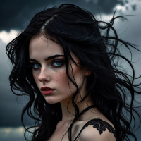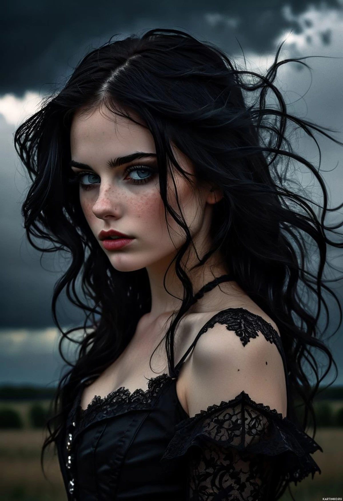 a white blouse with a black lace collar. The background is cloudy, suggesting