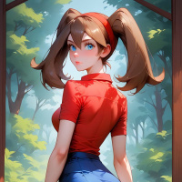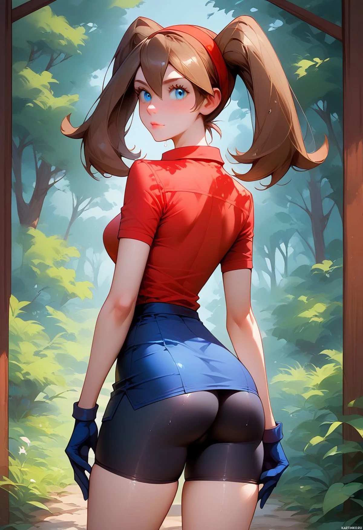 The image depicts a three-dimensional rendering of a character from behind, standing with their head turned slightly towards the viewer. The character is wearing a red top and blue jean shorts, with visible athletic legs suggesting physical fitness. The setting appears to be an outdoor area with lush greenery in the background.