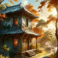 The image depicts a serene and picturesque scene of a traditional Chinese-style house nestled amidst nature. The house, which appears to be a one-story structure with an intricate wooden roof, is surrounded by