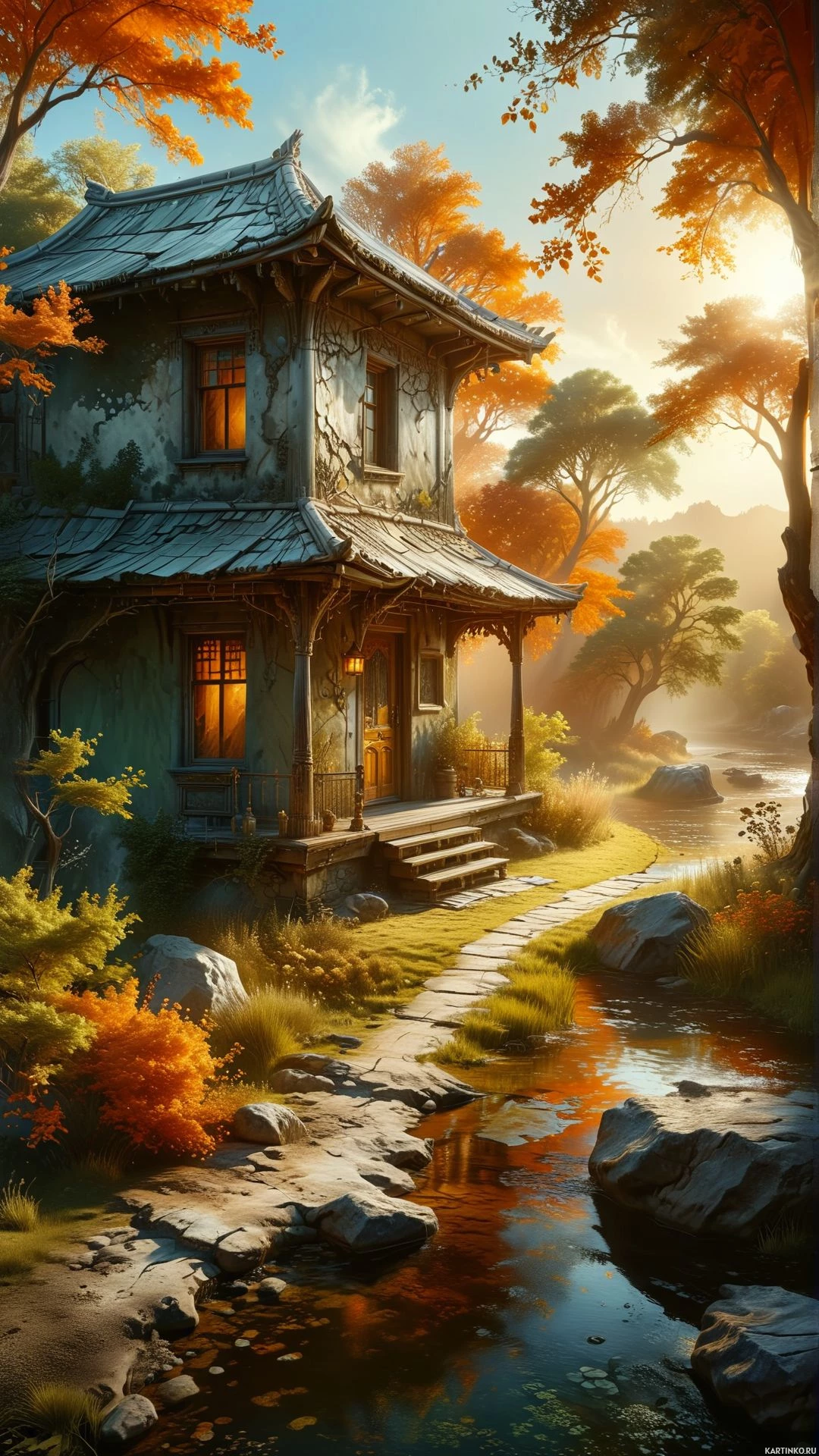 lush foliage and is enveloped in autumn colors—red and orange leaves from the surrounding trees, creating a vibrant backdrop. In front of the house, there's a small garden area with neatly arranged stones and plants, contributing to