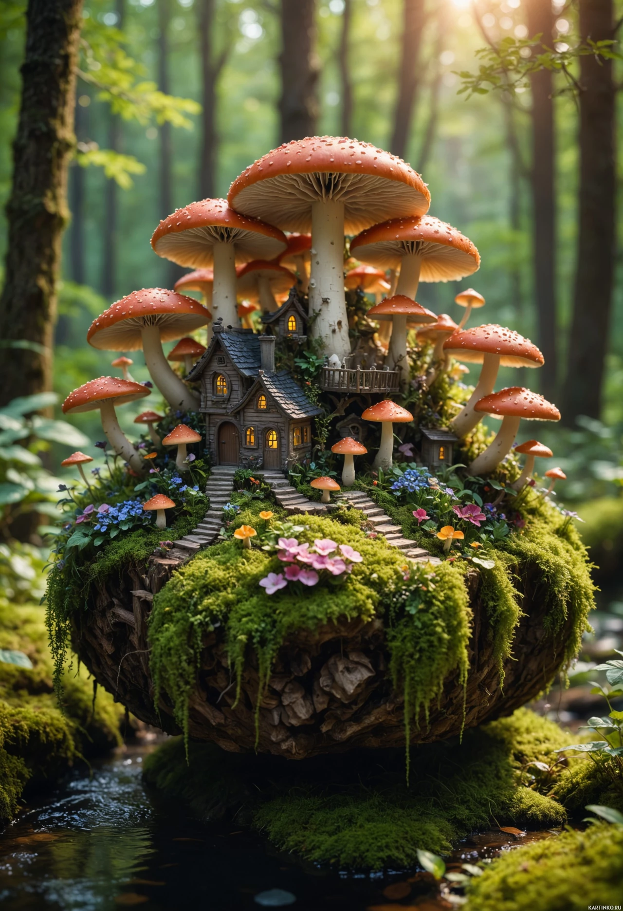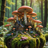a quaint house complete with chimneys and small windows, as if it's been carved out of the very fungus itself. The forest surrounding this unusual structure is lush and verdant, with