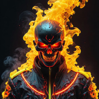 The image features a digital artwork of a character with a skull and fire elements. The central figure is a person depicted in profile, wearing what appears to be a helmet or headgear that has flames emanating from it. The overall color scheme is dominated by